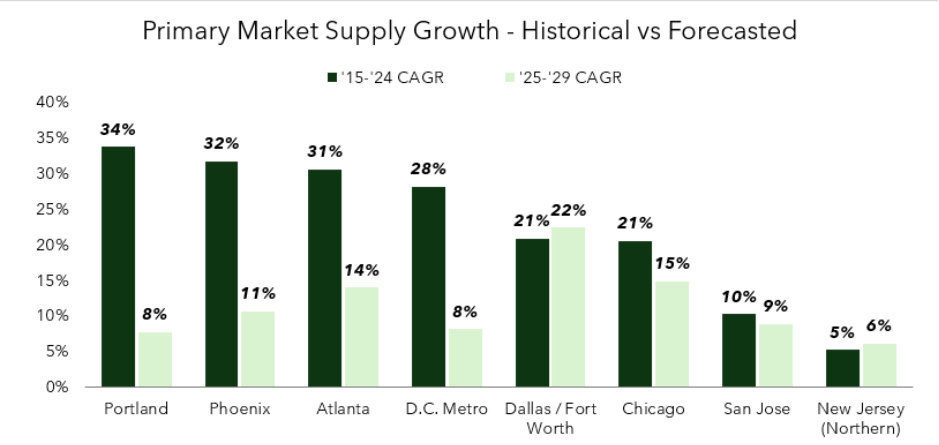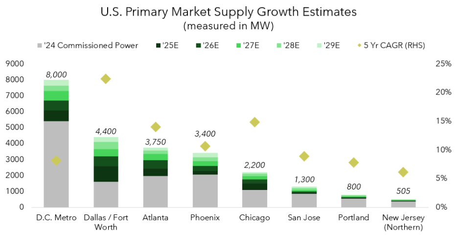 The Dallas-Fort Worth market saw an all-time high ~450 MW of new deals come in during 3Q25. Similar to Northern Virginia, it has excellent connectivity and cheaper power. One advantage that Dallas has over other markets is the comparatively inexpensive land prices and an extremely pro-data center building regulatory environment. Coupled with a more attractive “time-to-power”, the central locale of Dallas / Fort-Worth provides for neutral latency (i.e., somewhat equidistant from the West and East coast). Recent developments and new commitments for the next five years could drive Dallas-Fort Worth to become the second largest data center market in the U.S.
