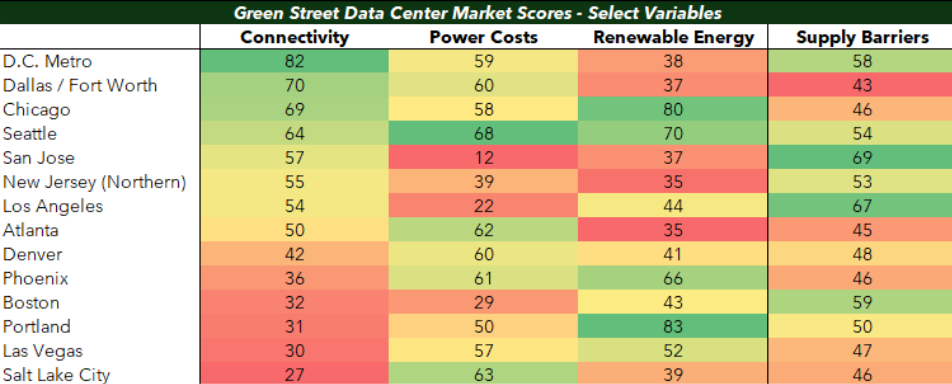In early 2024 Green Street developed a market grade methodology to attempt to quantify market quality in terms of long-term rental growth potential. Four of the ten components used in the calculation are listed below, three of which are unique to the data center sector.